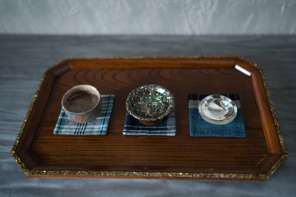 期間中会場にて出展者が異なる素材で作る酒杯で盆栽を愛でながら山名酒造の日本酒を3種味わって頂く利き酒セットを是非お試しください。